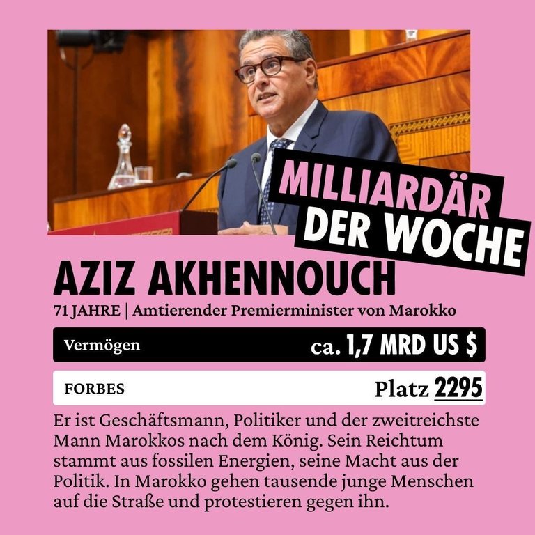 💣 Aziz Akhannouch wurde durch die Akwa Group reich, das vor allem in den Bereichen Gas, Öl, Chemie und Agrarwirtschaft tätig ist. Sein Vermögen basiert damit auf fossilen Energien, die die Klimakrise massiv anheizen. Ihm wird mangelnde Transparenz und Vetternwirtschaft vorgeworfen, statt soziale Gerechtigkeit und Klimaschutz voranzutreiben.