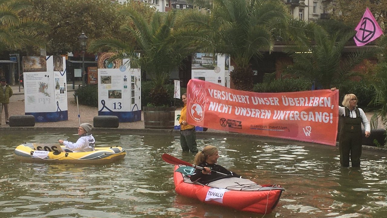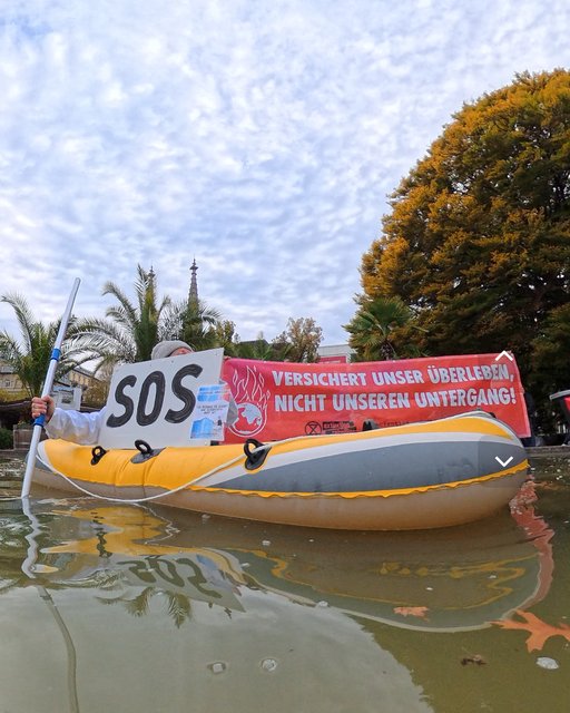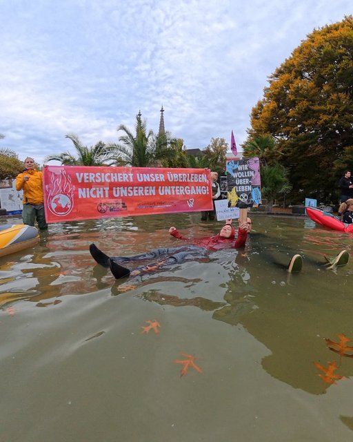 Heute sind wir mit Aktivist:innen verschiedener Klimagerechtigkeitsgruppen im Zentrum von Baden-Baden in das kalte Wasser des Teichs am Augustaplatz gestiegen. Mit dieser Aktion wollten wir auf die immer schneller voranschreitende Erderwärmung und den dadurch verursachten Anstieg des Meeresspiegels aufmerksam machen.