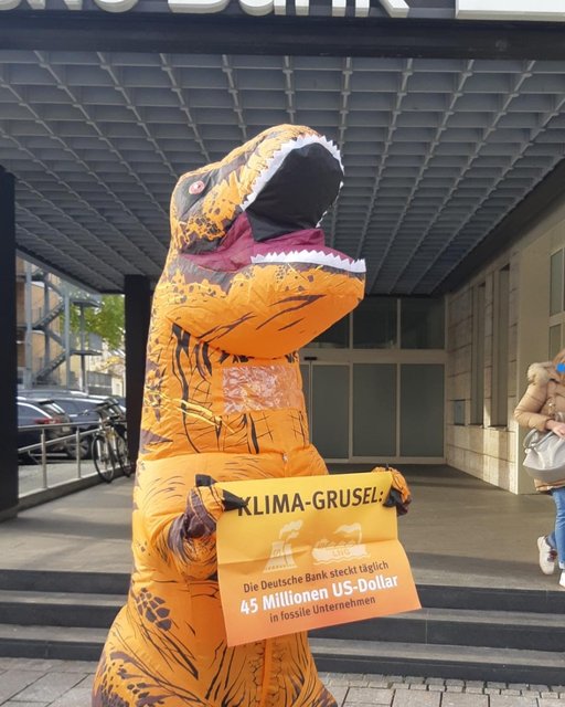 Mit Dino-Kostüm, Plakaten und Flyern haben wir die Deutsche Bank daran erinnert, dass ihre fossilen Investitionen Relikte aus einer längst vergangenen Ära sind. Während die Bank sich selbst als nachhaltig präsentiert, fließen weiterhin Milliarden in Kohle-, Öl- und Gasunternehmen – also in genau die Industrien, die unsere Lebensgrundlagen zerstören.