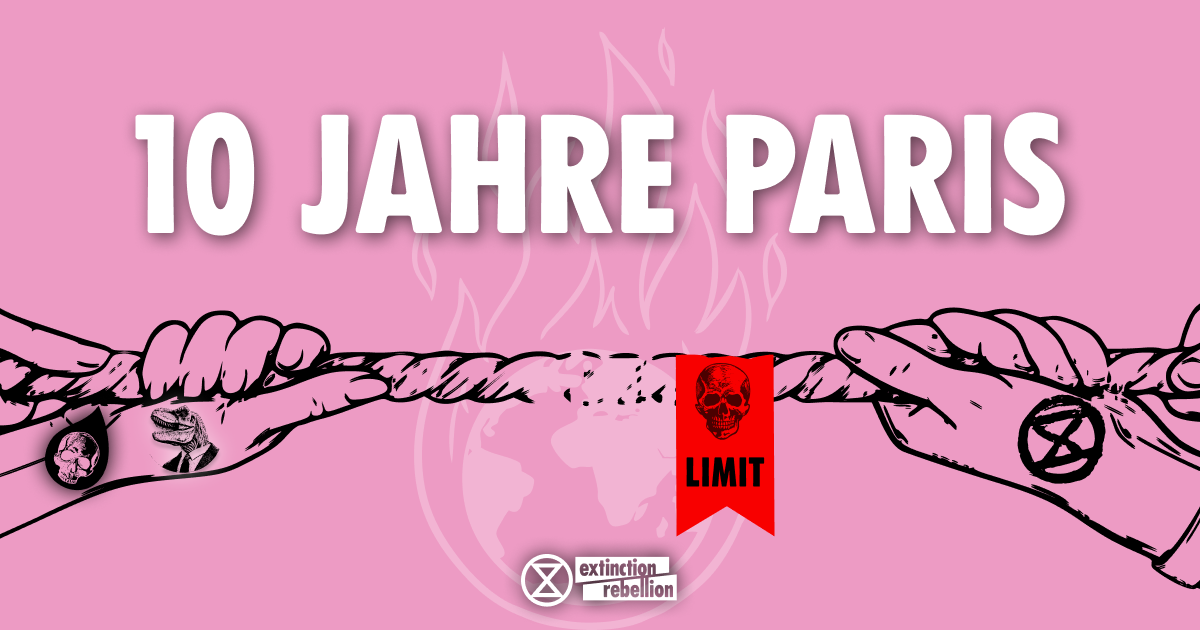 „Zehn Jahre nach Paris brennt die Welt – und die Politik schaut zu. Während Feuer unsere Wälder fressen, während Dörfer im Ahrtal weggespült werden und Menschen im globalen Süden ihre Heimat verlieren, wird weiter gezögert. Unser Tauziehen macht sichtbar, woran die Politik scheitert: Zukunft gegen fossile Interessen. Zehn Jahre nach Paris darf das Seil nicht länger in die falsche Richtung gezogen werden.“ Tanja Schneider, Extinction Rebllion