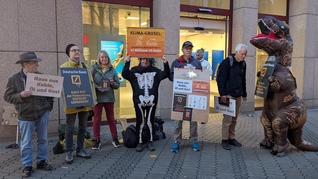 Gruseliger Besuch für die Innenstadt-Filiale der Deutschen Bank (DB): In Halloween-Kostümen und bei düsterer Musik machten wir am 31. Oktober 2025 auf die gruseligen Geschäfte der größten deutschen Bank aufmerksam. Denn die DB heizt mit ihren üblen Geschäften die Klimakrise unerbittlich an - sei es mit Geld für die Öl- und Gasförderung im Amazonasgebiet, mit der Finanzierung des südafrikanischen Kohlegiganten Eskom, mit Geld für philippinische Gas-Expansionspläne und vielen anderen kritikwürdigen Unternehmungen.