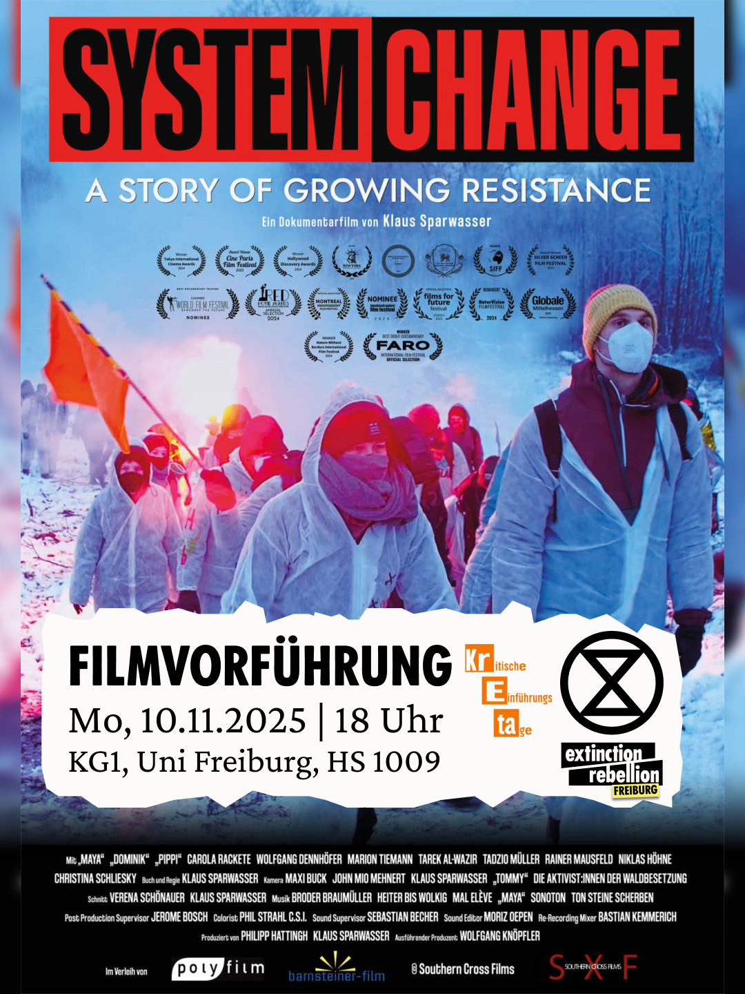 Ein Film über Widerstand, Waldschutz und die Frage nach einem echten Systemwechsel. Zu Beginn: kurzes Intro zu Extinction Rebellion Freiburg. Eintritt frei. Deutsch mit englischen Untertiteln. Content-Note: Szenen mit Polizeigewalt.